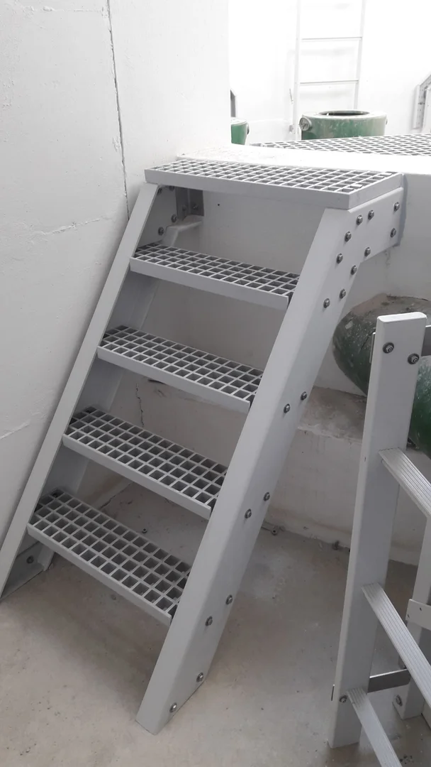 Os perfis estruturais das escadas são produzidos através do processo de pultrusão, assegurando elevada resistência mecânica e durabilidade. Os degraus, fabricados em PRFV por moldação, podem assumir configuração em gradil ou tampa e apresentam superfície antiderrapante, garantindo maior segurança na utilização.